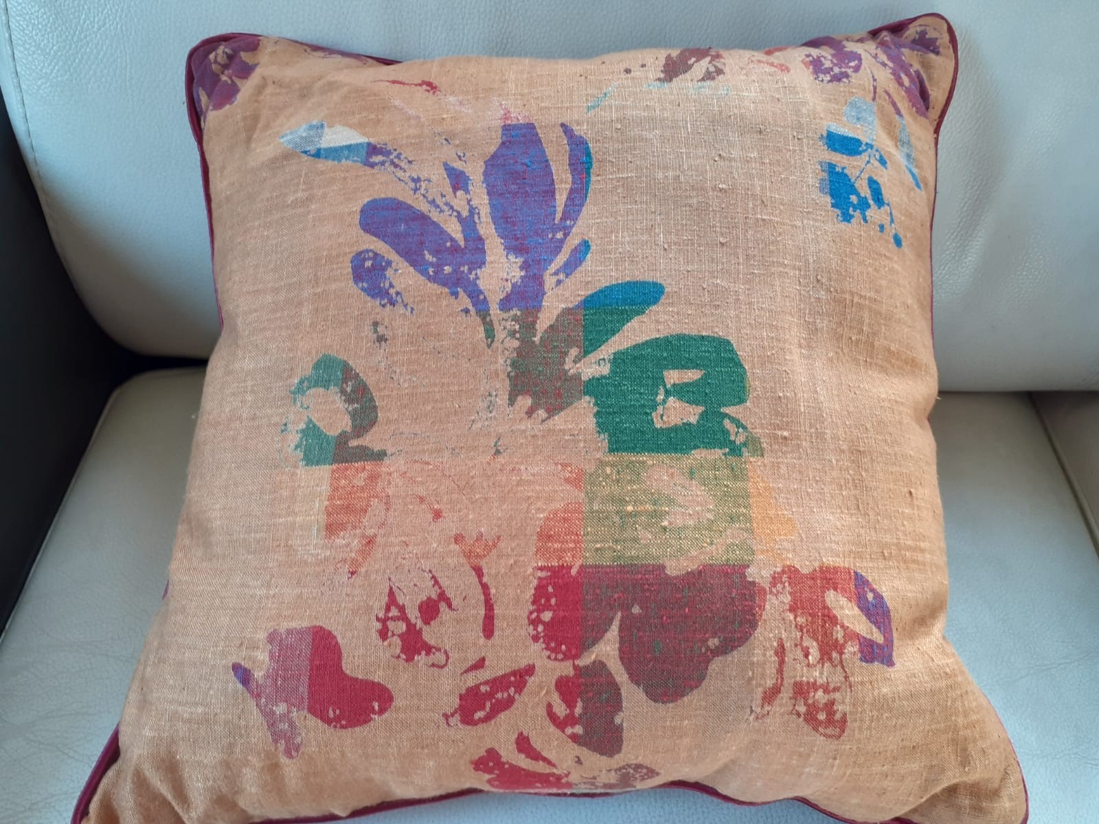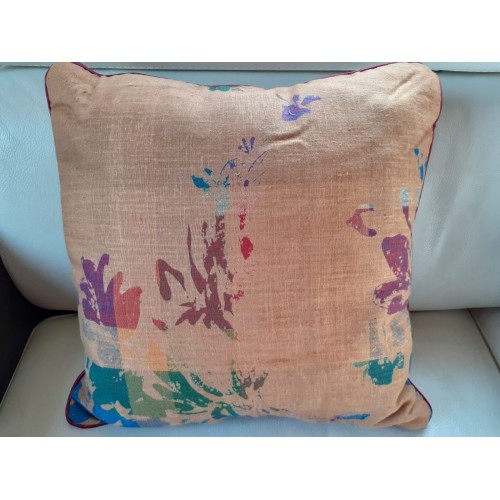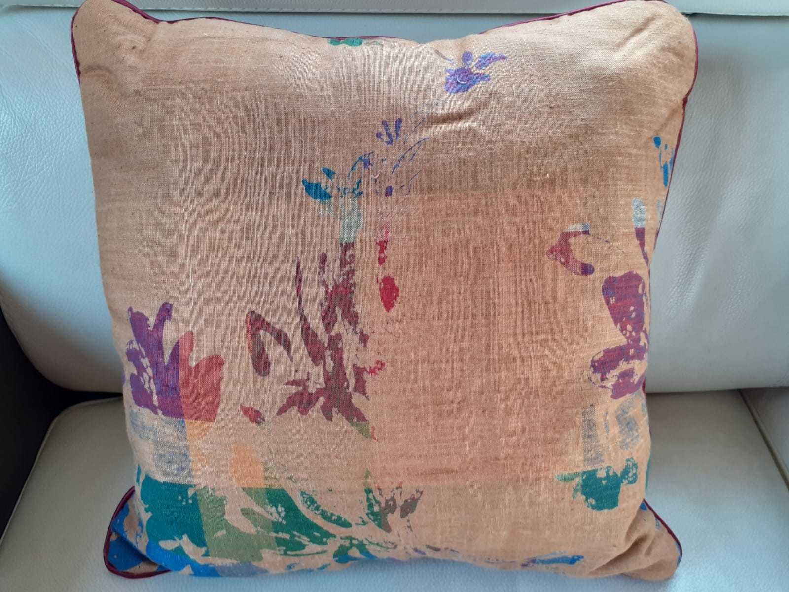 Tissu fond couleur sable avec impressions multicolores 100 % lin Lelièvre.