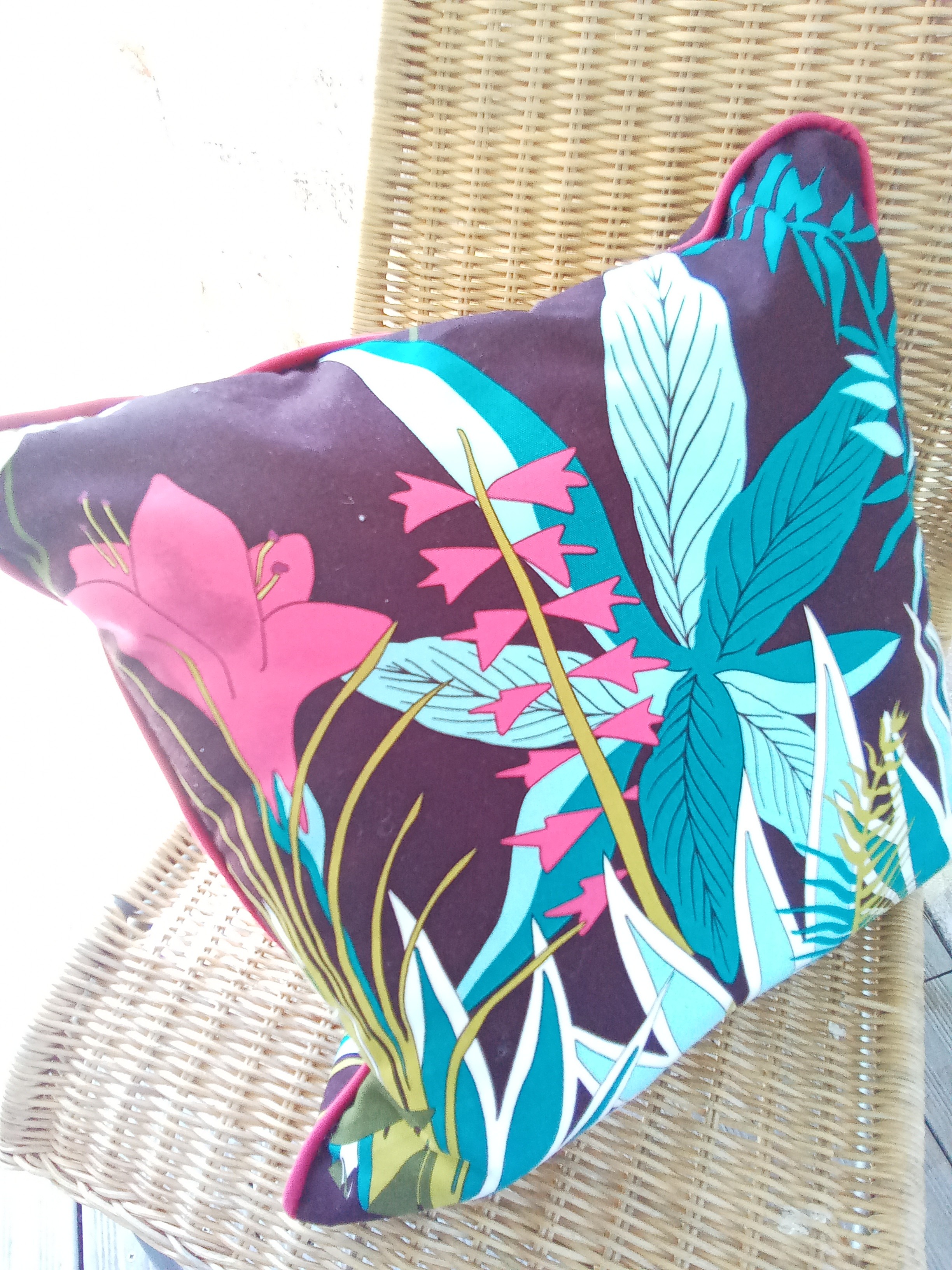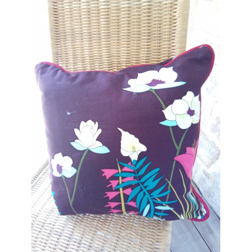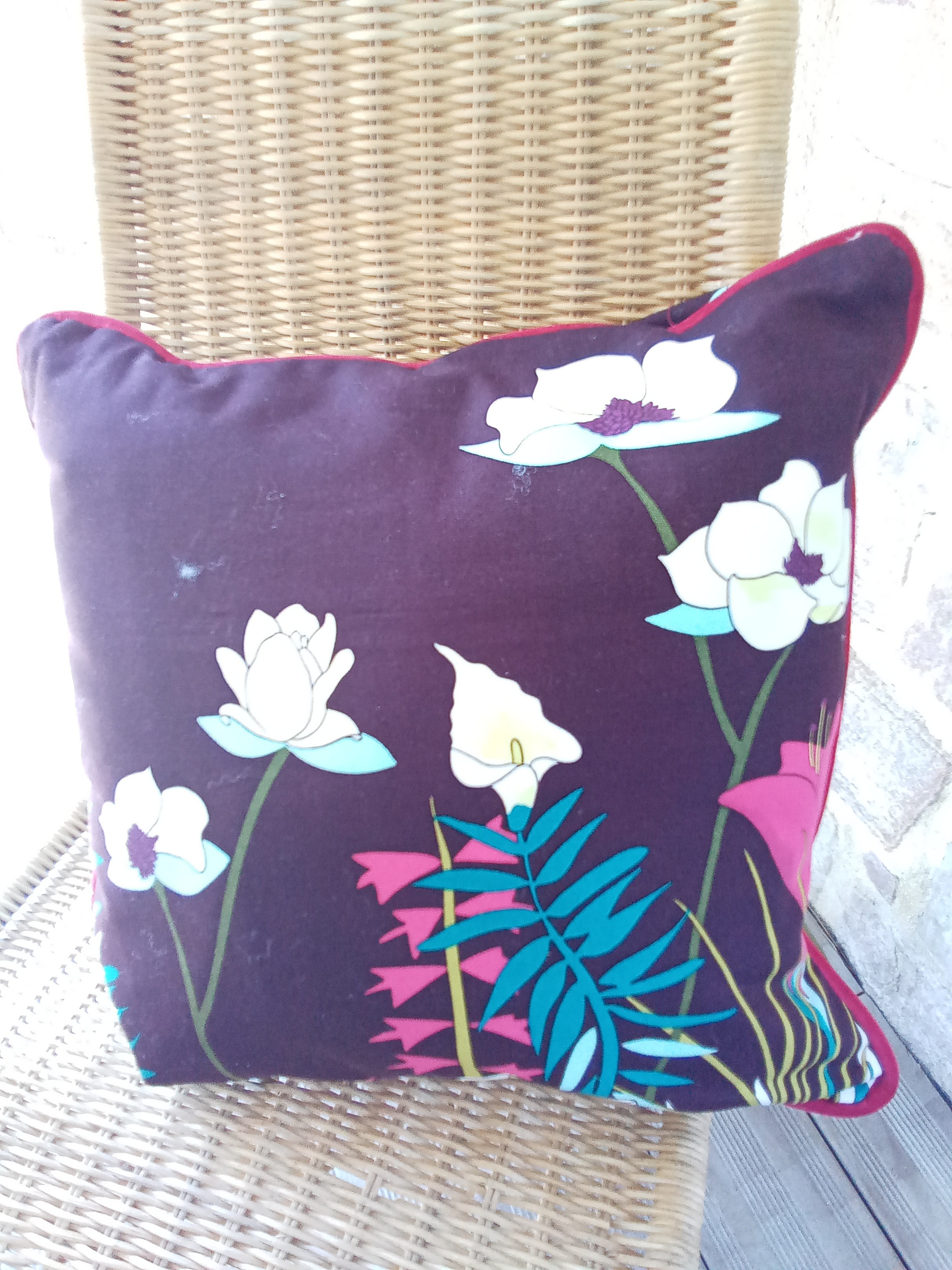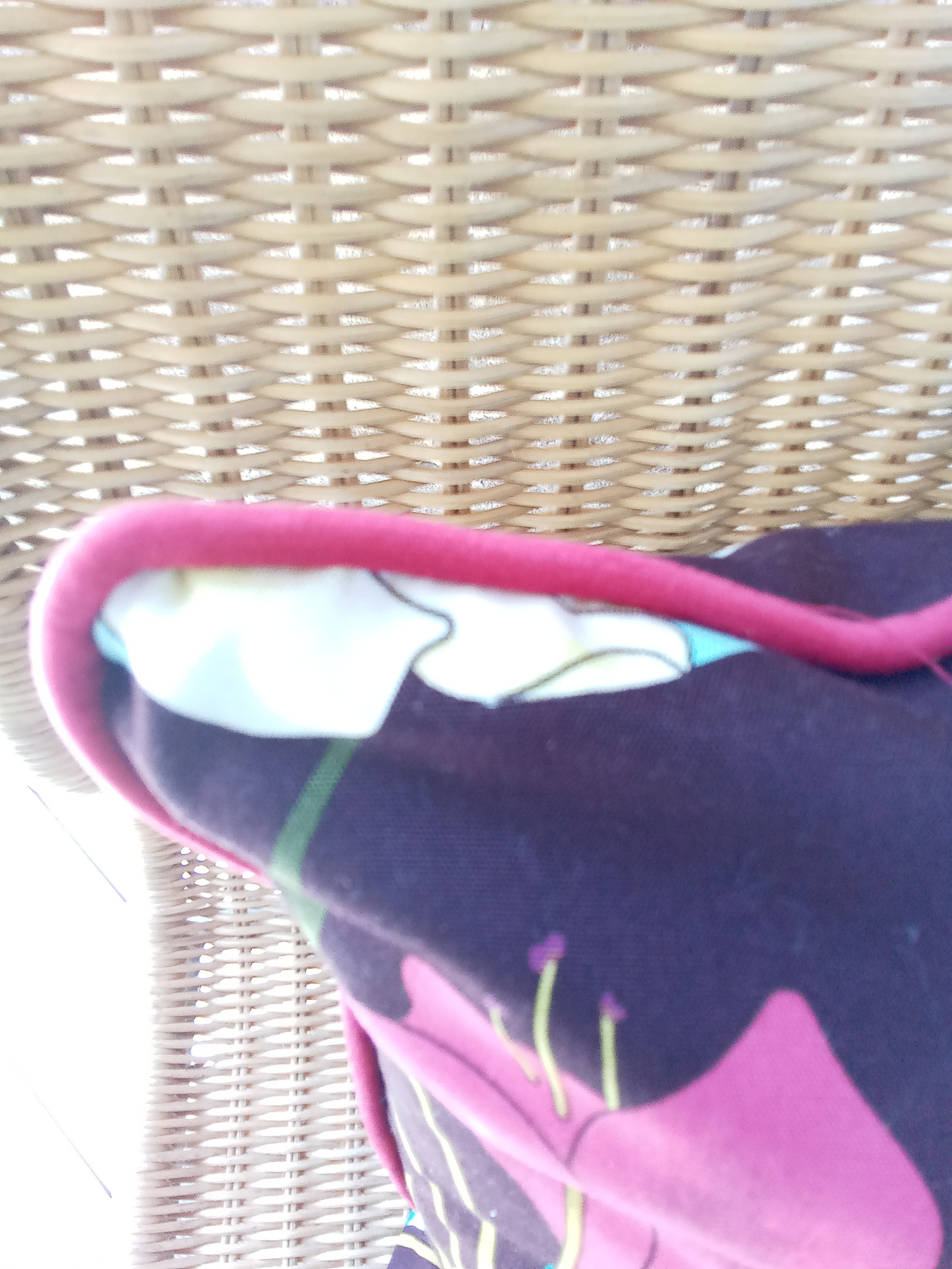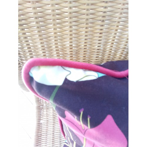 Tissu coton motif différent sur les deux côtés avec passepoil rose fushia, couleur de la fleur.