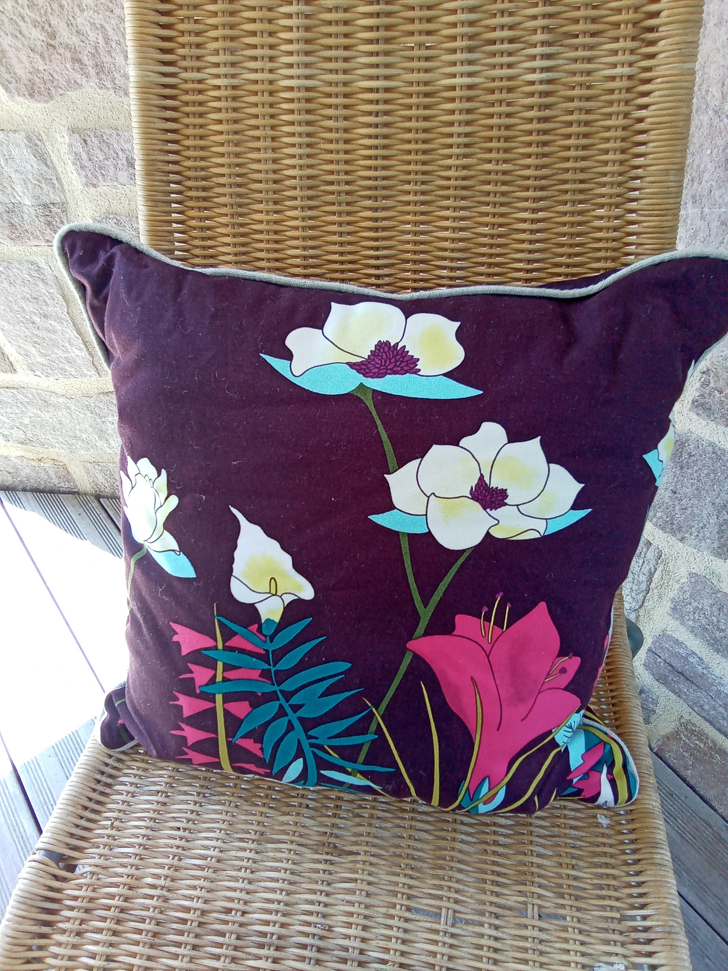 Tissu coton motif floral différent des deux côtés avec passepoil gris clair.